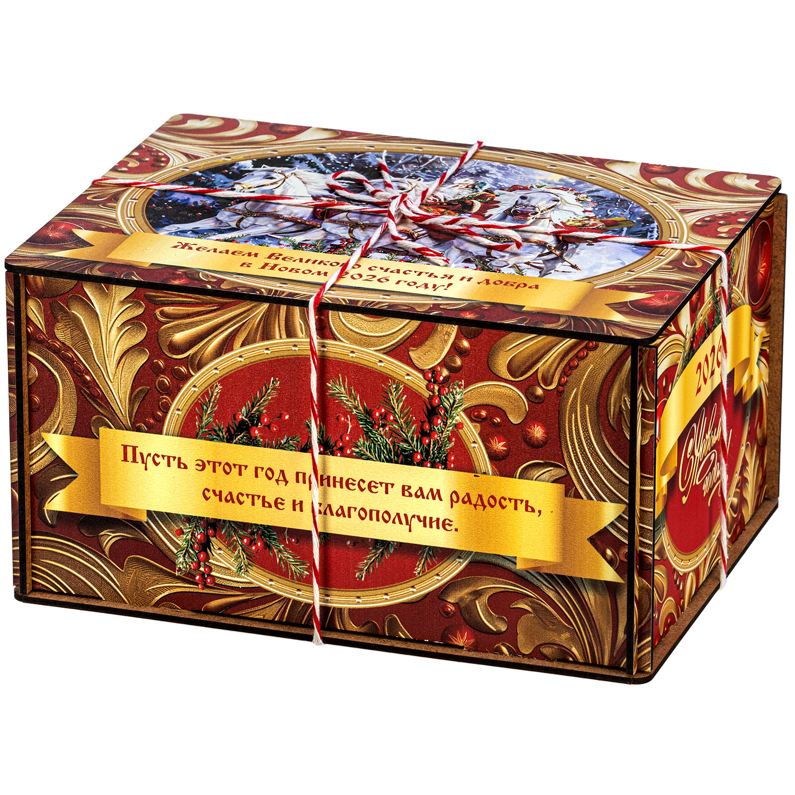 Интересный вариант новогоднего подарка – «Золотые узоры (большая) (Легенды Москвы)». Он представлен в разделе Дерево. Отлично подойдет на подарок в 2026 году с символом Лошадь. Внутри такого презента находится кондитерский набор весом 1500 граммов.